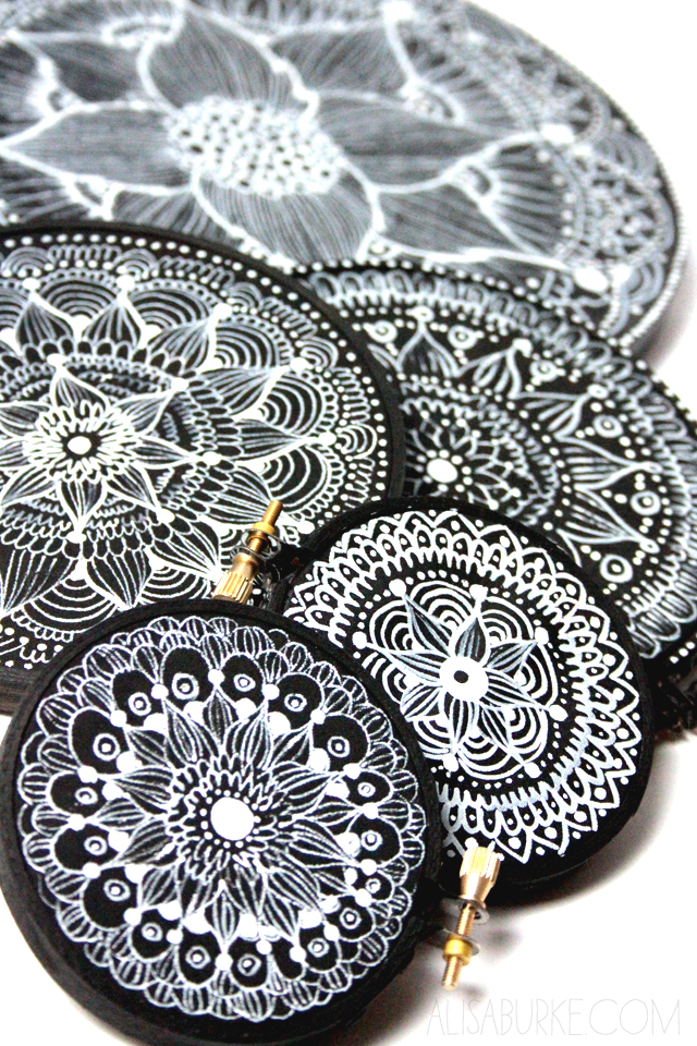 I use fabric, anything will work. Stretch and tighten the fabric in the hoop and then paint it with black acrylic paint. Next I use a white Sharpie paint pen and go to town filling the surface with doodles!