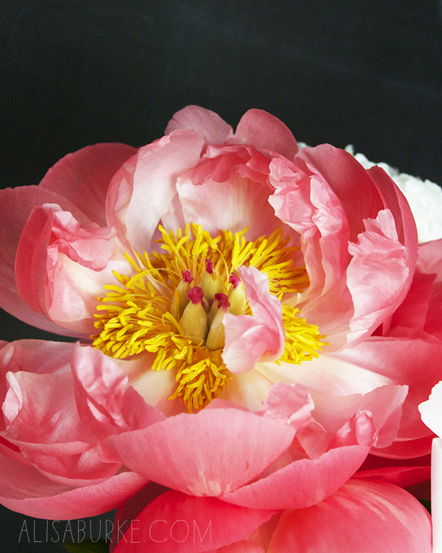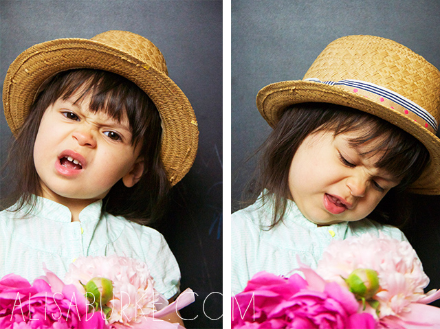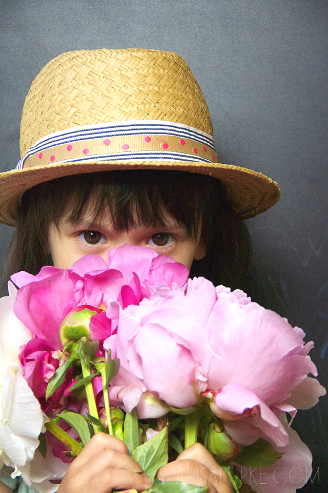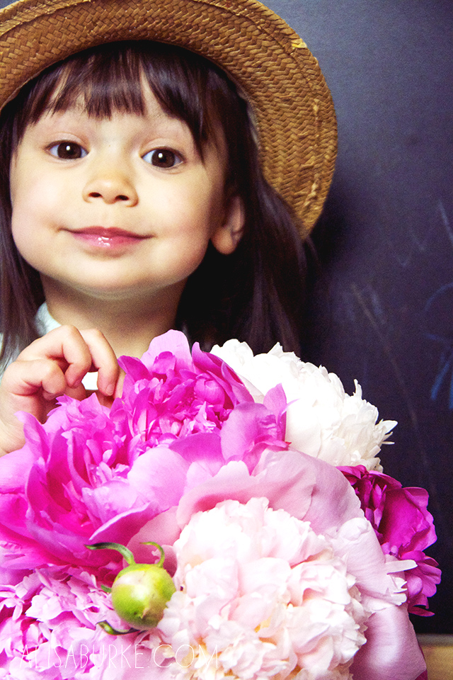 I love the bright peonies (and beautiful child!) against the dark background. Thank you.