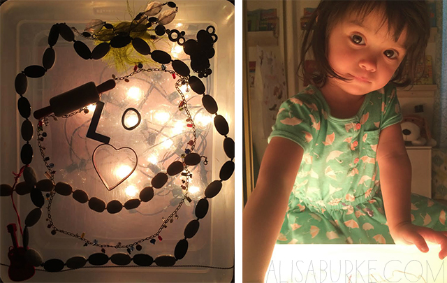 1. HOMEMADE LIGHT BOX: Grab a clear plastic box, fill it with Christmas lights, turn out the lights and instantly you have a light box. All three of us are having so much fun playing with it! We use it for sorting games (colorful beads and anything translucent), playing and learning shapes (jar lids, bracelets, cookie cutters, magnet letters), a place for drawing and painting and Lucy's favorite- using all my jewelry to create shapes. For some reason a light box makes everything more fun!