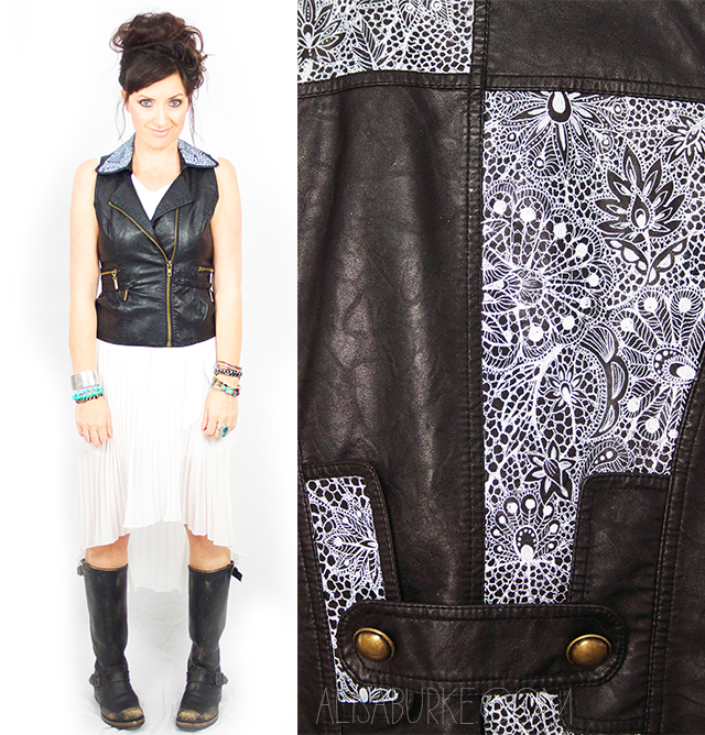 I've been busy creating all kinds of fun projects for my latest online class Redefine Creativity and one of the lessons is all about using drawings and doodles to transform just about anything into a piece of art. I can't share everything from the class but I thought I would share one of my favorite projects. With only an oil based Sharpie pen (and lace as my inspiration), I was able to transform a black pleather vest into a totally unique and creative fashion statement!