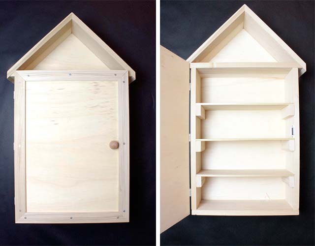 Andy used poplar hobby wood from Home Depot to create a simple cabinet in the shape of a house. He added a door with a knob and used a magnetic latch so the door would withstand toddler play.