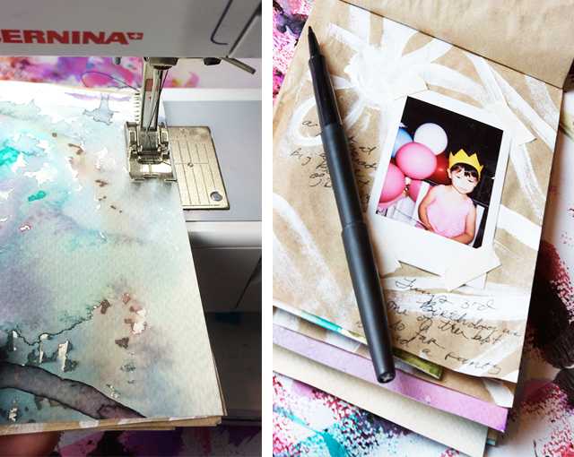 Then I create a front and back cover. Typically I will use heavier paper- watercolor paper, card stock or even cardboard. I love sewing with paper and will often make use of tiny scraps to create embellishments with my machine