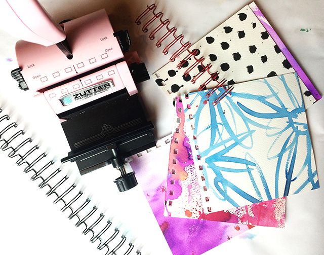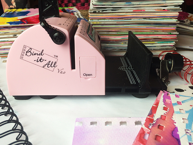 I start by gathering my paper and then using the Bind-It-All to punch through the paper. It will punch through just about anything and I've found that it will punch through about 3-4 heavy duty pieces of watercolor paper that has been painted.
