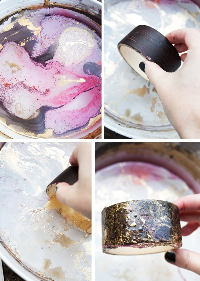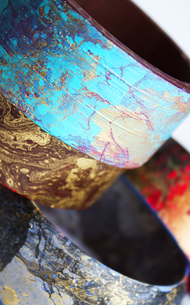 There are so many ways to turn a plain wooden bangle into something really unique- one of my favorite ways it marbleizing with spray paint.