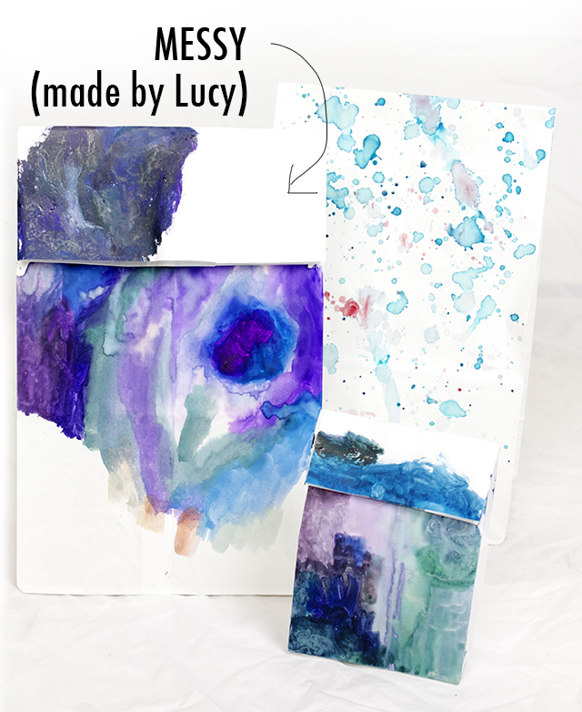 When I am making wrapping paper and gift bags, Lucy loves to get in on the action and getting painting messy with watercolors (for any age) is a really simple way to make a colorful gift bag.