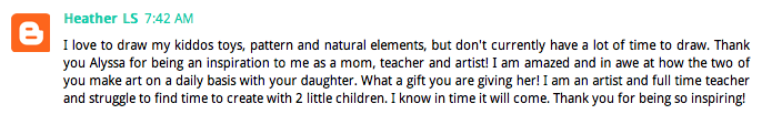 I love to draw my kiddos toys, pattern and natural elements, but don't currently have a lot of time to draw. Thank you Alyssa for being an inspiration to me as a mom, teacher and artist! I am amazed and in awe at how the two of you make art on a daily basis with your daughter. What a gift you are giving her! I am an artist and full time teacher and struggle to find time to create with 2 little children. I know in time it will come. Thank you for being so inspiring!
