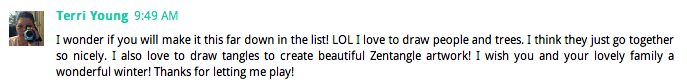 I wonder if you will make it this far down in the list! LOL I love to draw people and trees. I think they just go together so nicely. I also love to draw tangles to create beautiful Zentangle artwork! I wish you and your lovely family a wonderful winter! Thanks for letting me play!
