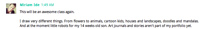 Looks like another wonderful class! I like to draw flowers. I also like to doodle (circles, flowers), and I really love to make scribbly marks!