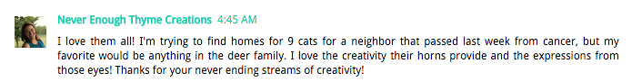 I love them all! I'm trying to find homes for 9 cats for a neighbor that passed last week from cancer, but my favorite would be anything in the deer family. I love the creativity their horns provide and the expressions from those eyes! Thanks for your never ending streams of creativity!
