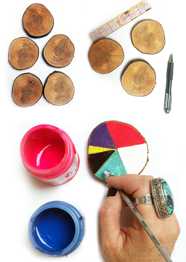 I obsessed with color which means I am obsessed with the color wheel so I painted my own loose interpretation of the color wheel on each wood slice. Optional: coat wood with a clear polyurethane.