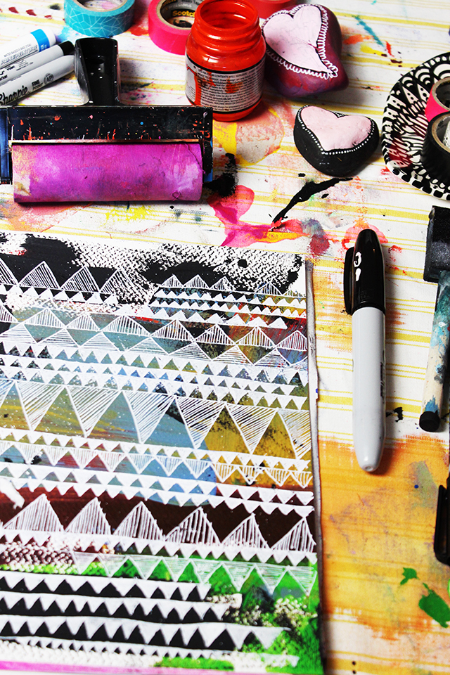 I may draw with pen and shade with pencil. Or draw in white ink, and add a drop shadow with a gel pen. Just be sure your paint is 100% dry before using your pens - especially the pricier ones!
